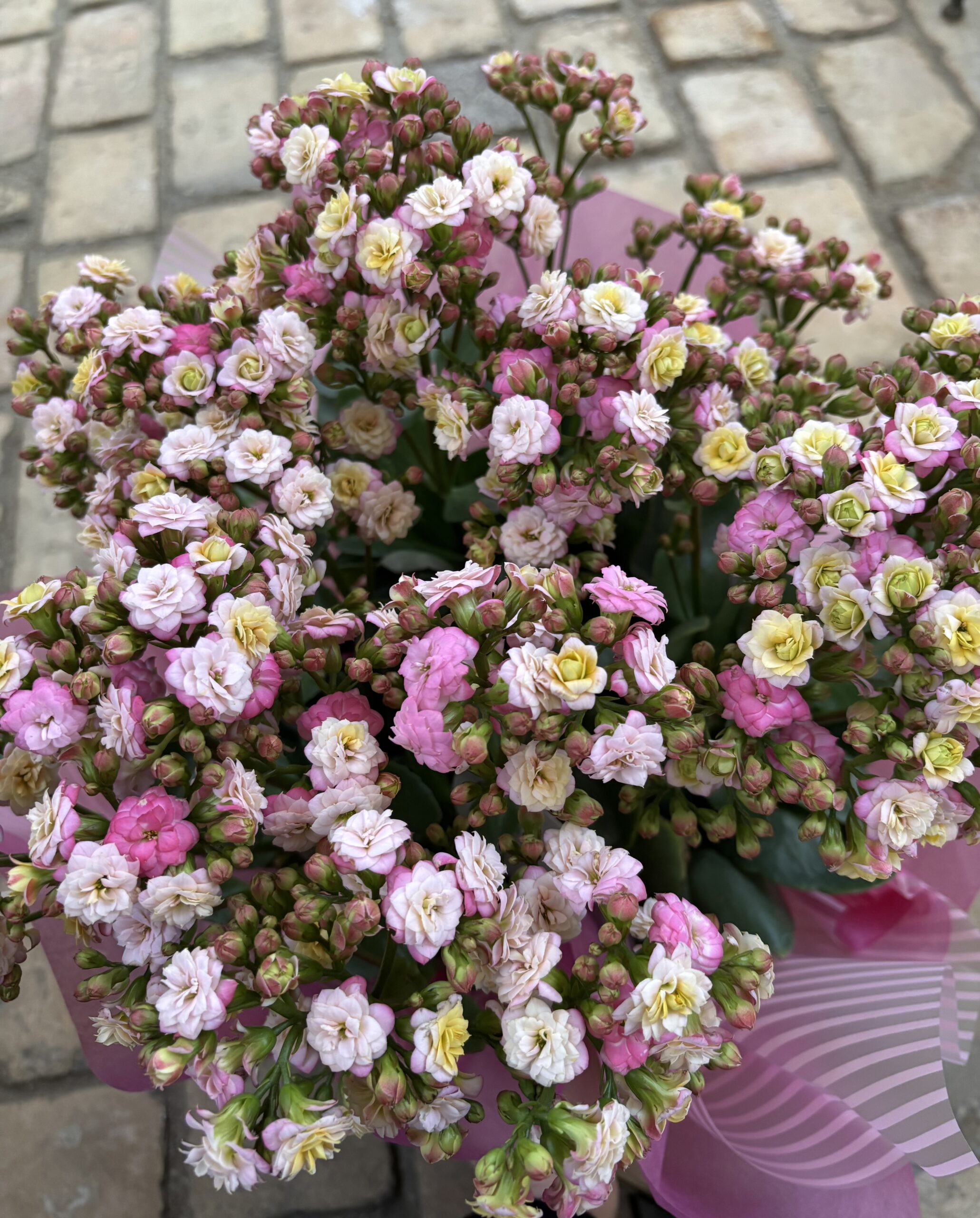 1月25日号週刊いいだプレゼント企画! カランコエ 「メイリ―ブーケ」 草丈 40~50㎝ 株幅 15~30㎝ 用途 鉢植え 水やり 土の表面が乾いたらたっぷり 咲き進むにつれて、黄色からピンクへと色が変化する、グラデーションが特徴の八重咲きカランコエです。花束のような、豪華なボリューム感と、花持ちの良さが魅力です。明るい室内での管理がおすすめです。