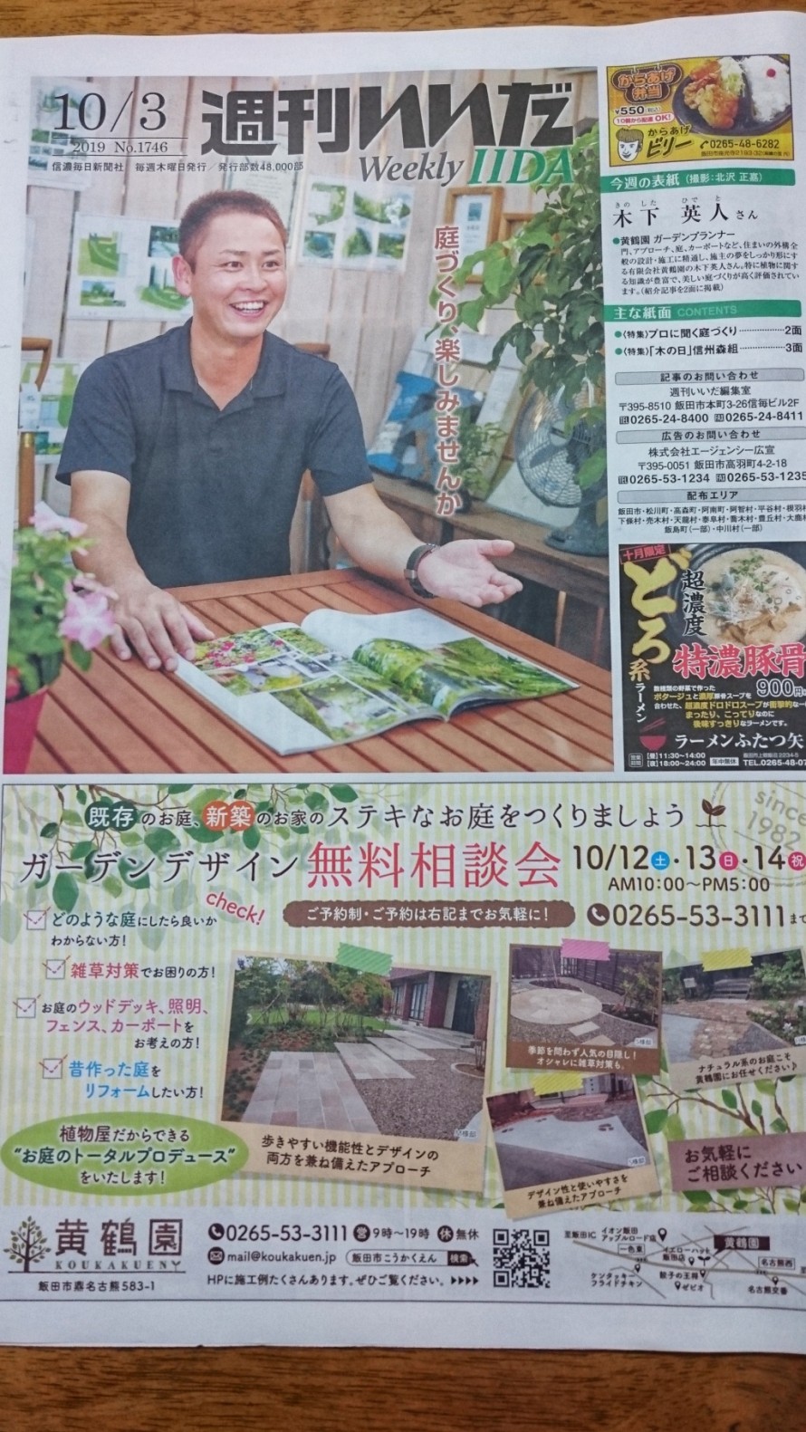 週刊いいだ様(*^▽^*) すでに見ていただいた方もいると思いますが… 週刊いいだ様に載せていただきました。 「見たよ~」とお声をかけてくださる方が 思った以上にたくさんいらっしゃることに ビックリ( ゚Д゚) 週刊いいだ様様です ありがとうございます 記事にもありますように、 お庭の無料相談会があります。 ご予約受け付けております。 店舗までお電話ください。 TEL0265-53-3111 どんなことでも構いません。 お話、聞かせてくださいね(´ー`)