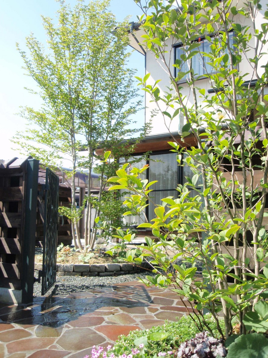 新緑が美しい、玄関前の庭/飯田市 | 長野県飯田市の庭、外構、エクステリアは黄鶴園(こうかくえん)にお任せください!